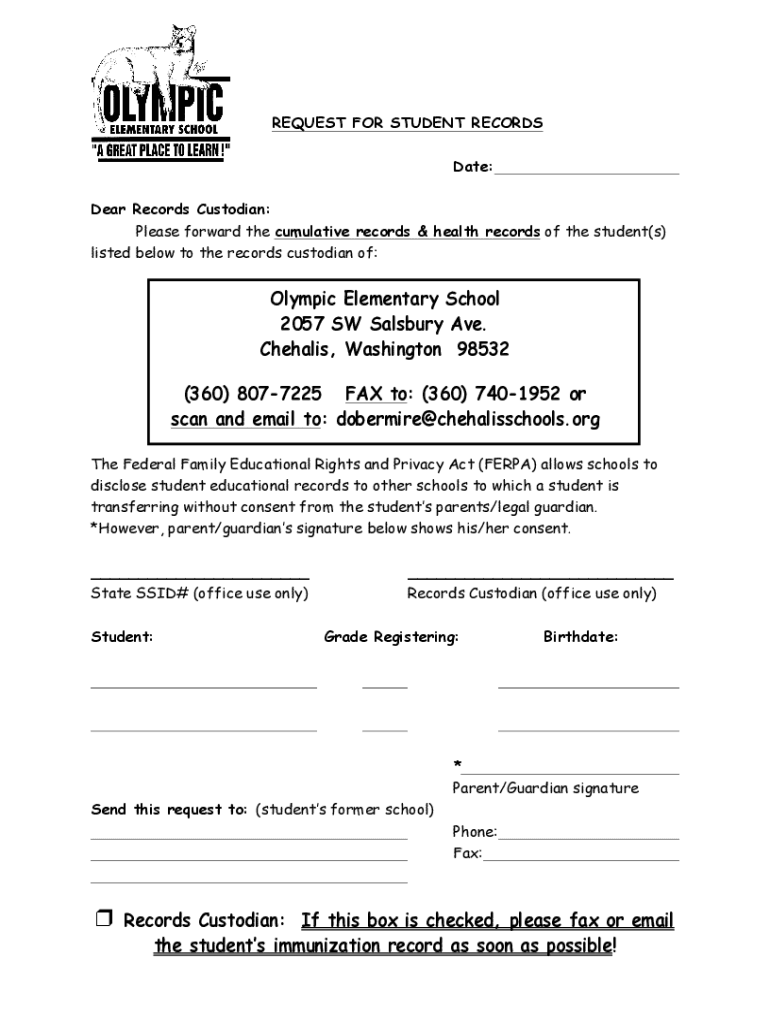 REQUEST FOR STUDENT RECORDS Date: Dear Records Custodian: Please forward the cumulative records & health records of the student(s) listed below to the records' custodian of:Olympic Elementary School