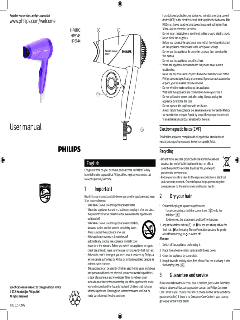 Register your product and get support atwww.philips.com/welcome HP8100 HP8143 HP8144bc1000 Mauser manualdFor additional protection, we advise you to install a residual current device (RCD) in the