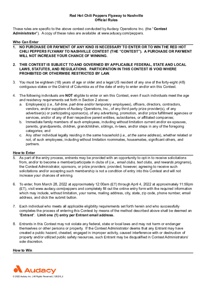 Get the free AUD com Web Contest Rules Red Hot Chili Peppers Nashville Flyaway.docx