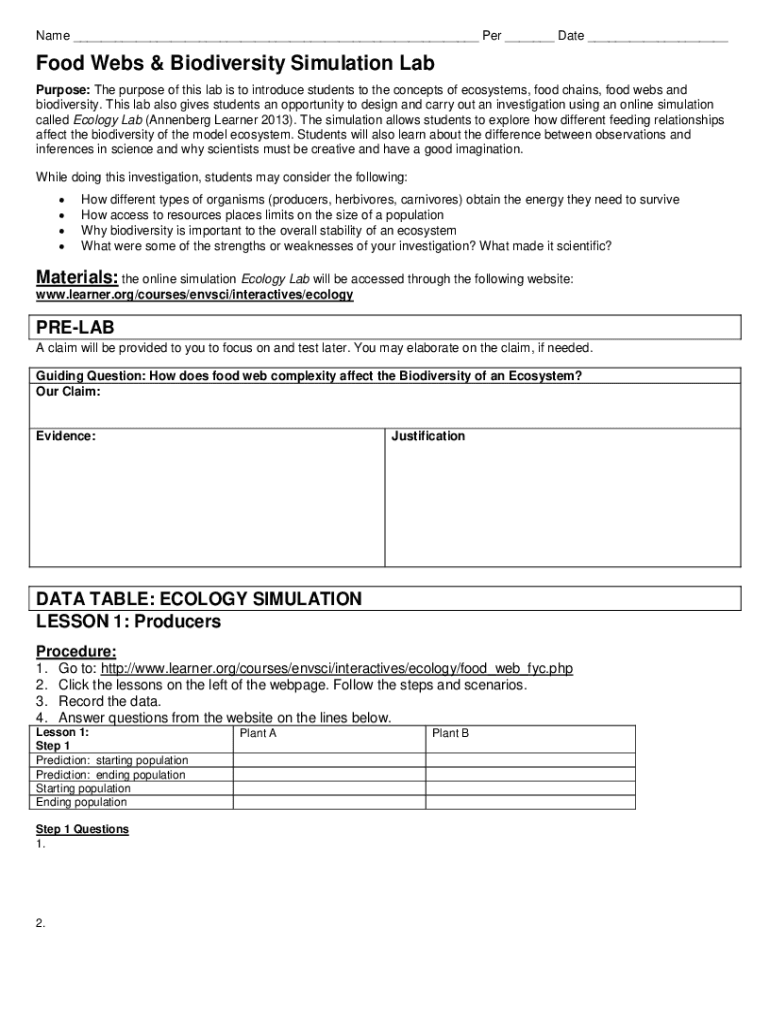 Name ___ Per ___ Date ___Food Webs & Biodiversity Simulation Lab Purpose: The purpose of this lab is to introduce students to the concepts of ecosystems, food chains, food webs and biodiversity. This