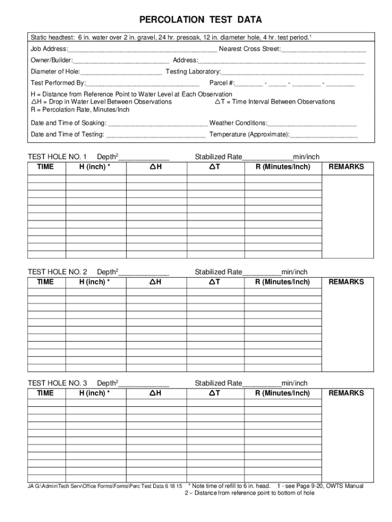 PERCOLATION TEST DATA Static headrest: 6 in. water over 2 in. gravel, 24 hr. presoak, 12 in. diameter hole, 4 hr. test period.1 Job Address:___ The Nearest Cross Street:___ Owner/Builder:___ Address:___