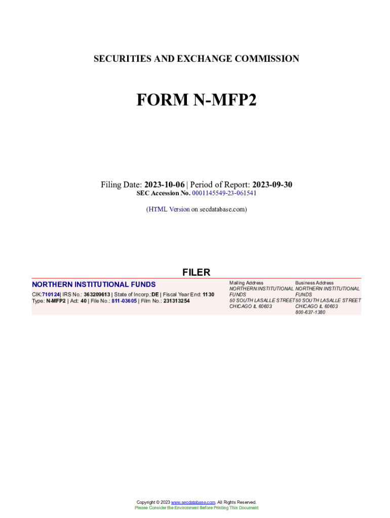 Get the free NORTHERN INSTITUTIONAL FUNDS Form N-MFP2 Filed 2023-10-06. Accession Number