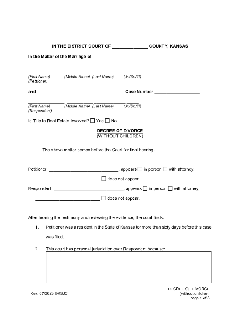 IN THE DISTRICT COURT OF ___ COUNTY, KANSAS In the Matter of the Marriage of ___ ___ ___ ___(First Name) (Petitioner)(Middle Name) (Last Name)and(Jr./Sr./III)Case Number ______ ___ ___ ___ (First