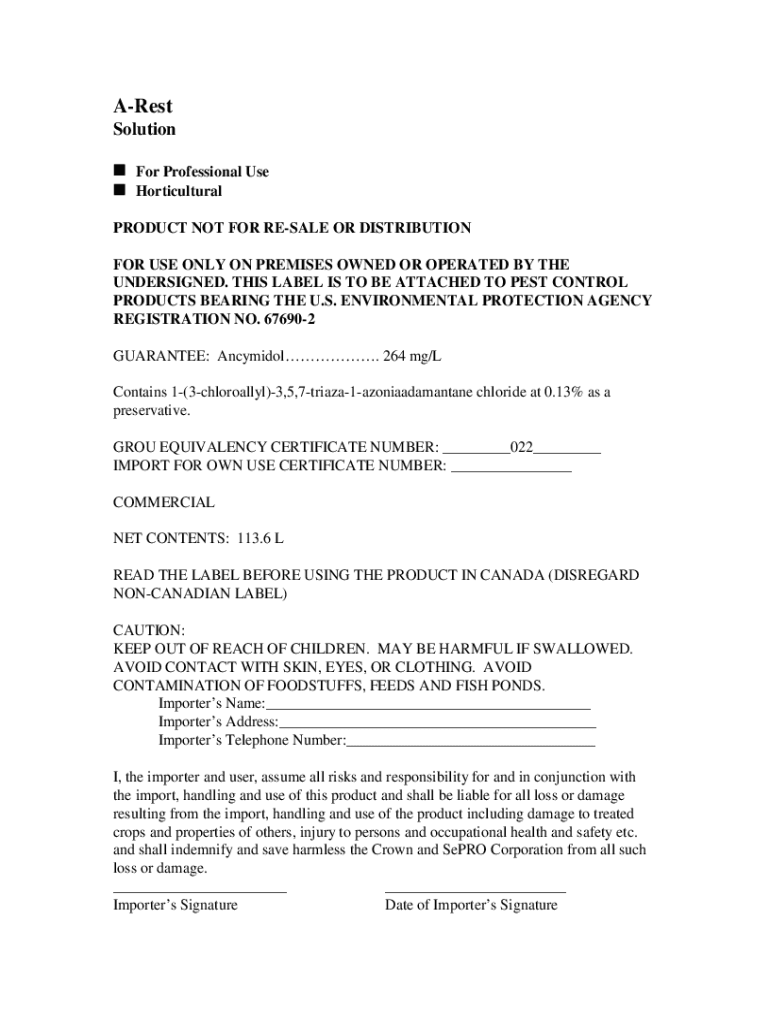 Rest Solution For Professional Use Horticultural PRODUCT NOT FOR RESALE OR DISTRIBUTION FOR USE ONLY ON PREMISES OWNED OR OPERATED BY THE UNDERSIGNED. THIS LABEL IS TO BE ATTACHED TO PEST CONTROL