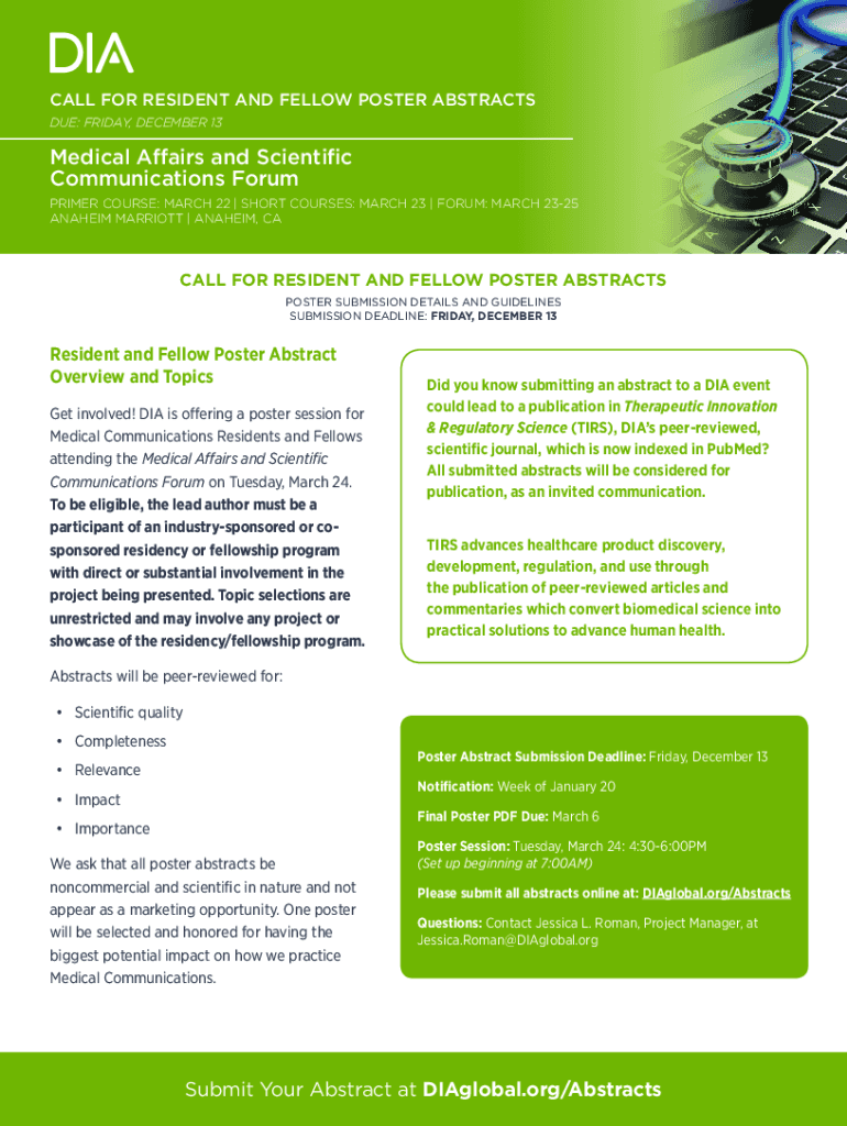 CALL FOR RESIDENT AND FELLOW POSTER ABSTRACTS DUE: FRIDAY, DECEMBER 13Medical Affairs and Scientific Communications Forum PRIMER COURSE: MARCH 22 | SHORT COURSES: MARCH 23 | FORUM: MARCH 2325 ANAHEIM
