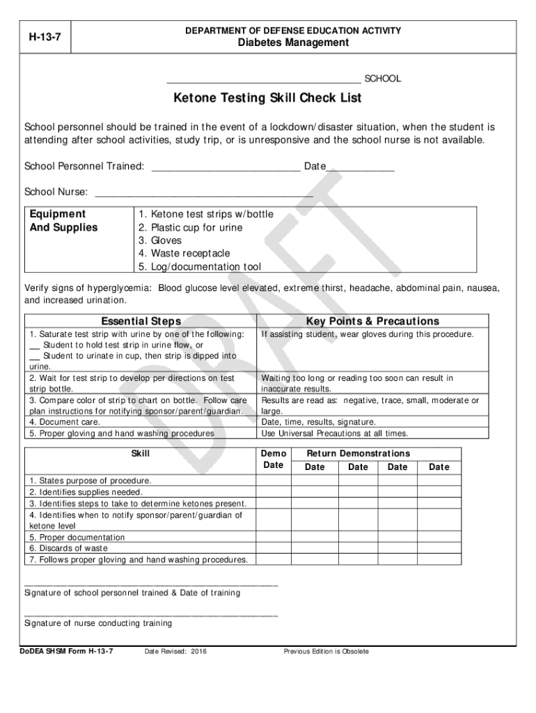 DEPARTMENT OF DEFENSE EDUCATION ACTIVITYH137Diabetes Management ___ SCHOOLKetone Testing Skill Check List School personnel should be trained in the event of a lockdown/disaster situation, when the