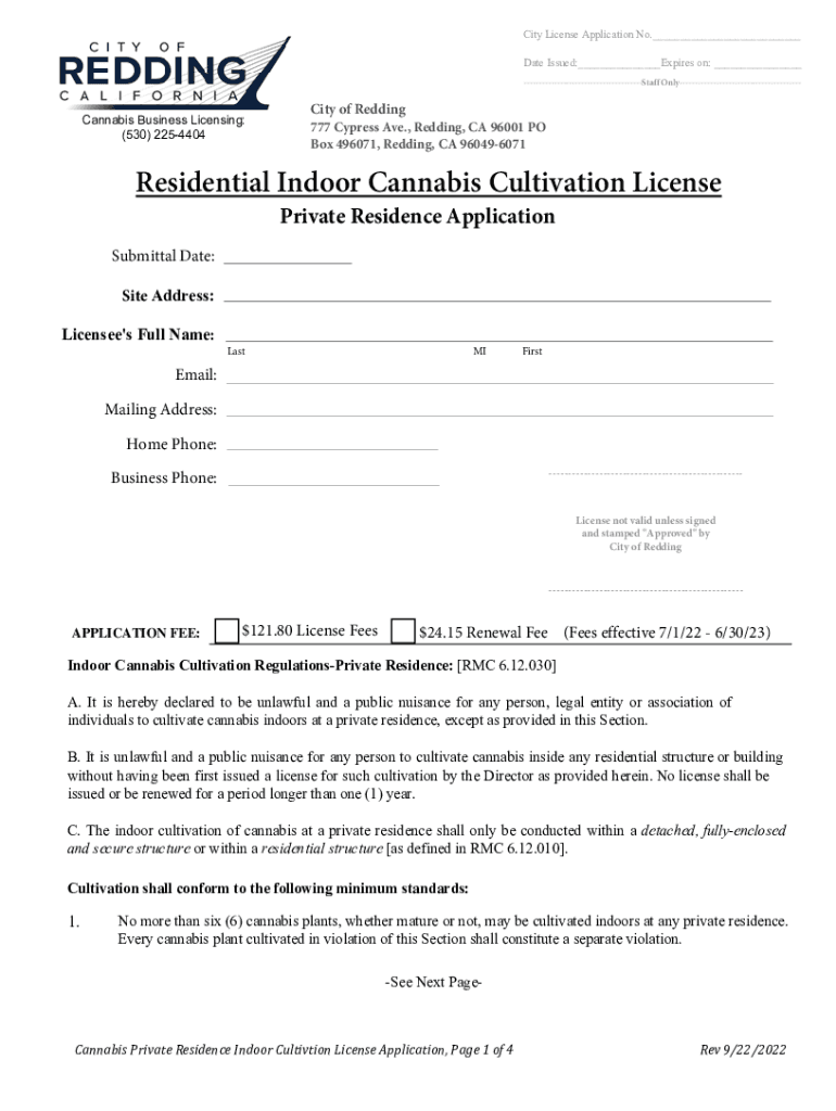 City License Application No.___ Date Issued:___Expires on: ___ Staff OnlyCannabis Business Licensing: (530) 2254404City of Redding 777 Cypress Ave., Redding, CA 96001 PO Box 496071, Redding, CA 960496071Residential