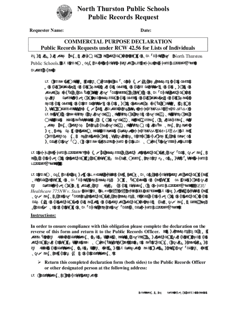 North Thurston Public Schools Public Records Request Requester Name:Date:COMMERCIAL PURPOSE DECLARATION Public Records Requests under RCW 42.56 for Lists of Individuals RXRURXURUJDQL]DWLRQRUEXVLQHVVKDVUHTXHVWHGDOLVWRILQGLYLGXDOVIURPNorth