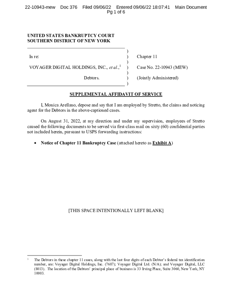 2210943mewDoc 376Filed 09/06/22 Entered 09/06/22 18:07:41 Pg 1 of 6Main DocumentUNITED STATES BANKRUPTCY COURT SOUTHERN DISTRICT OF NEW YORK In re: VOYAGER DIGITAL HOLDINGS, INC., et al., 1 Debtors.)