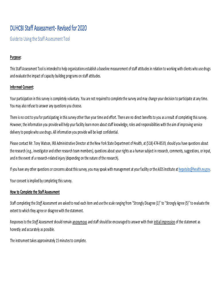DUH, CBI Staff Assessment Revised for 2020 Guide to Using the Staff Assessment Tool Purpose: This Staff Assessment Tool is intended to help organizations establish a baseline measurement of staff