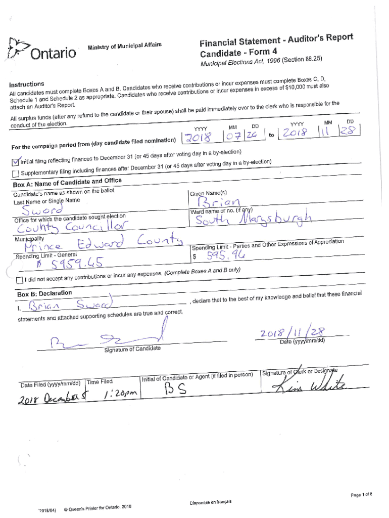 Kr\'OntarioFinancial Statement Auditor\'s ReportMinistry of Municipal AffairsCandidate Form 4Municipal Elections Act, 1996 (Section 88.25)Schedule