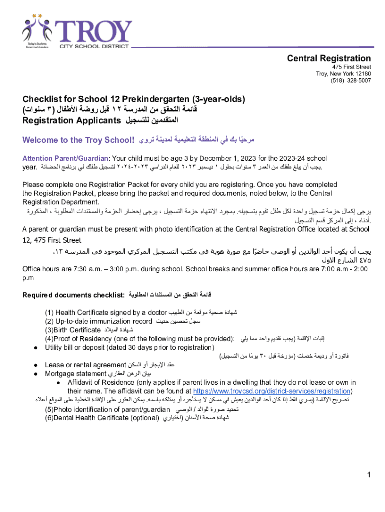 Checklist for School 12 Prekindergarten (3yearolds)) (Registration Applicants Welcome to the Troy School! Attention Parent/Guardian: Your child must be age 3 by December 1, 2023, for the 202324 school