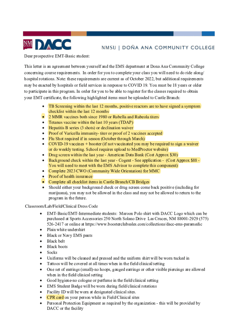 Dear prospective Basic student: This letter is an agreement between yourself and the EMS department at Dona Ana Community College concerning course requirements. In order for you to complete your