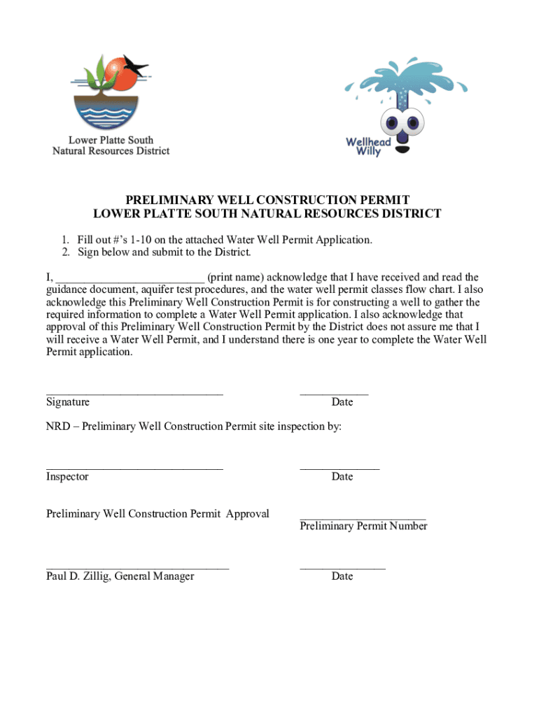 PRELIMINARY WELL CONSTRUCTION PERMIT LOWER PLATTE SOUTH NATURAL RESOURCES DISTRICT 1. Fill out #s 110 on the attached Water Well Permit Application. 2. Sign below and submit to the District. I, ___