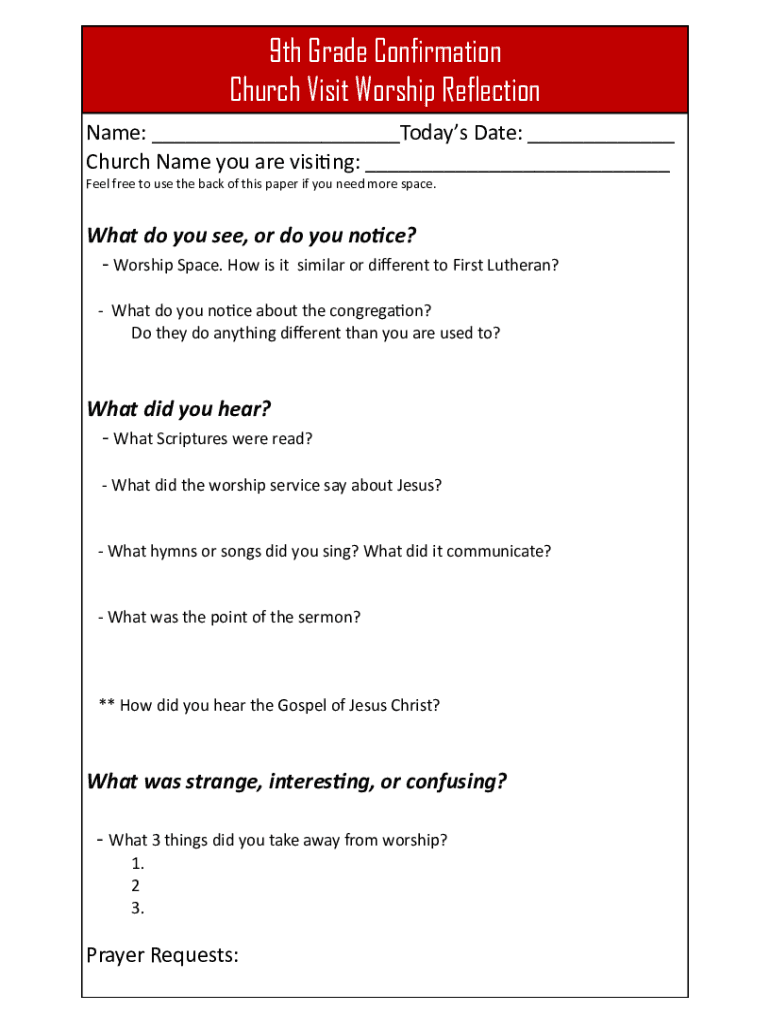 9th Grade Confirmation Church Visit Worship Reflection Name: ___Today's Date: ___ Church Name you are visiting: ___ Feel free to use the back of this paper if you need more space. What do you see,