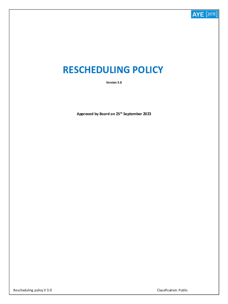 RESCHEDULING POLICY Version 3.0Approved by Board on 25th September 2023Rescheduling policy V 3.0Classification: PublicCONTENTS Objective: ___ 2 Key Features: ___ 2 Process: ___ 3 Program Review: ___