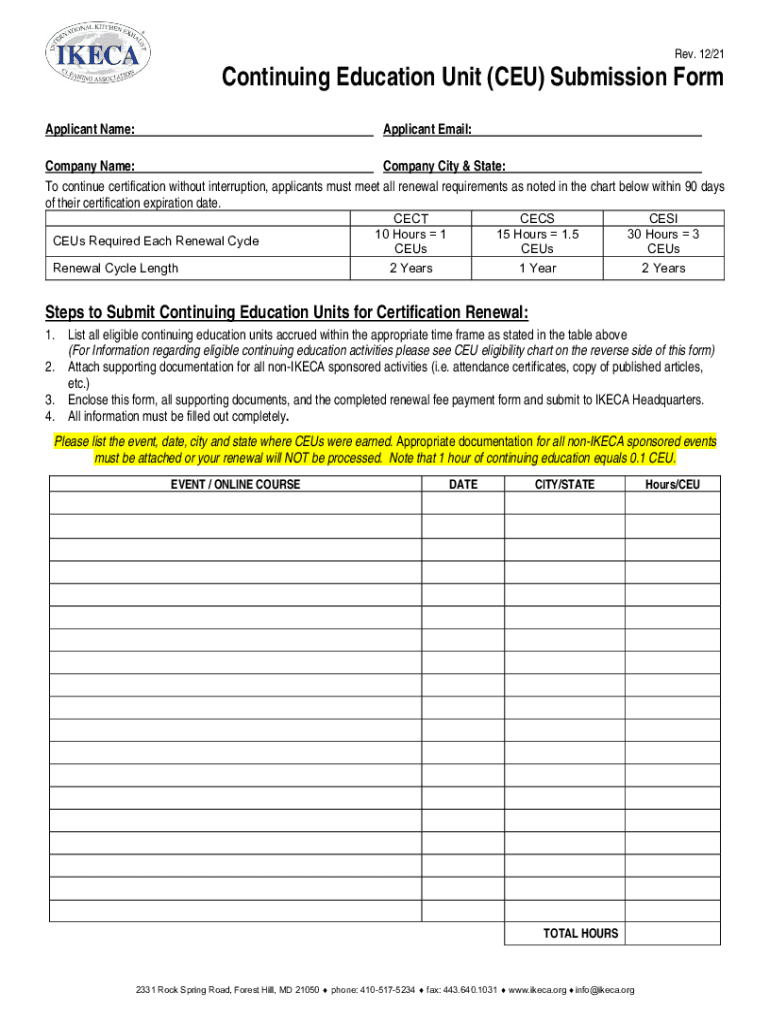 Rev. 12/21Continuing Education Unit (CEU) Submission Form Applicant Name:Applicant Email:Company Name: Company City & State: To continue certification without interruption, applicants must meet all