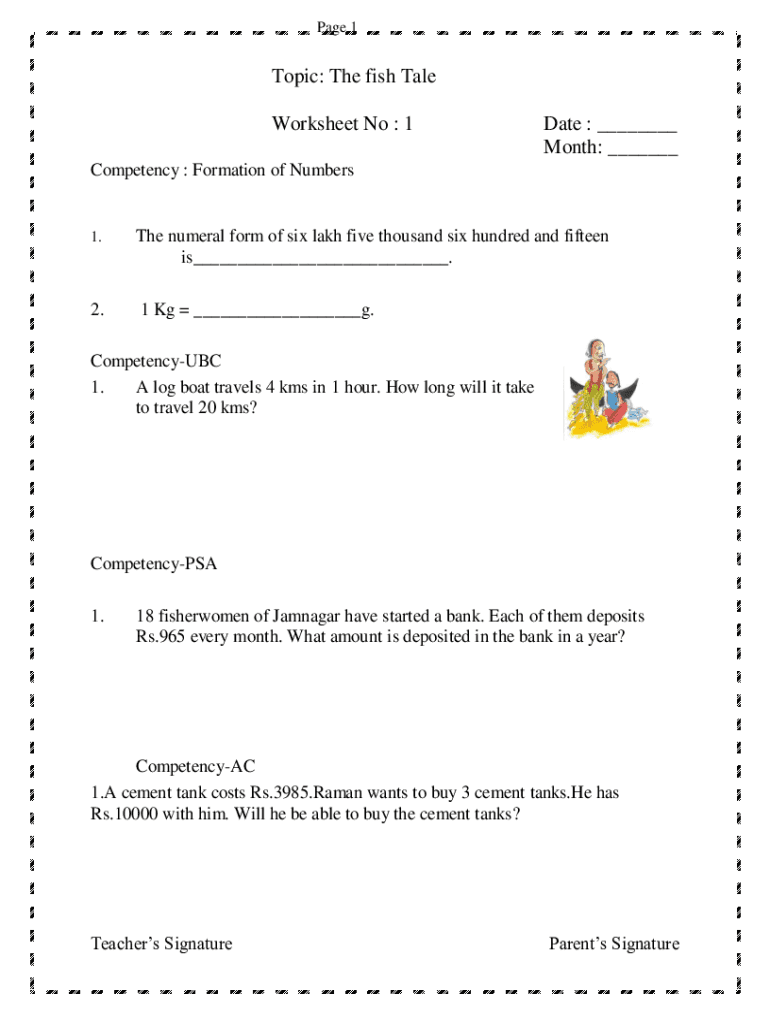 Page 1Topic: The fish Tale Worksheet No : 1Date : ___ Month: ___Competency : Formation of Numbers1.2. The numeral form of six lakh five thousand six hundred and fifteen is___. 1 Kg ___g. CompetencyUBC