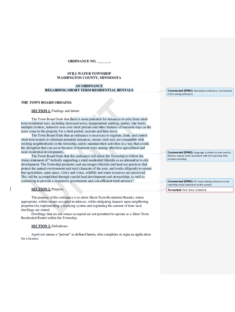 ORDINANCE NO. ___, STILLWATER TOWNSHIP WASHINGTON COUNTY, MINNESOTA AN ORDINANCE REGARDING SHORT TERM RESIDENTIAL RENTALSCommented [EPM1]: Standalone ordinance; not included in the zoning ordinance