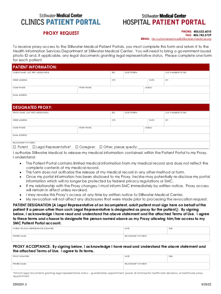 PHONE: 405.533.6010 FAX: 405.742.5739 EMAIL: hiscustomerservice@stillwatermedical.orgPROXY Request receive proxy access to the Stillwater Medical Patient Portals, you must complete this form and return