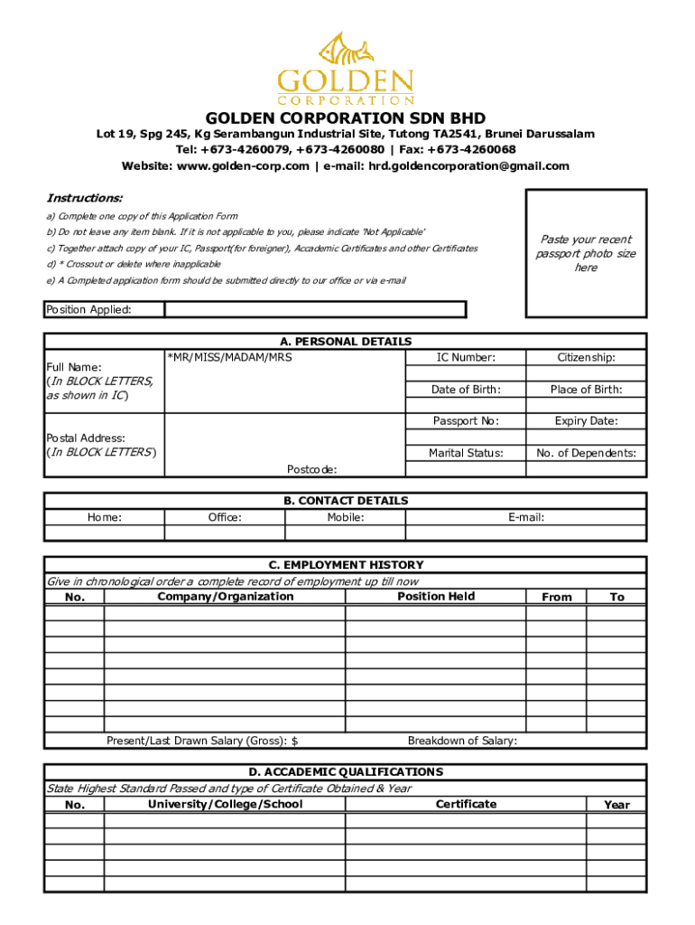 GOLDEN CORPORATION SDN BHD Lot 19, SPG 245, Kg Serambangun Industrial Site, Tu tong TA2541, Brunei Darussalam Tel: +6734260079, +6734260080 | Fax: +6734260068 Website: www.goldencorp.com | email: