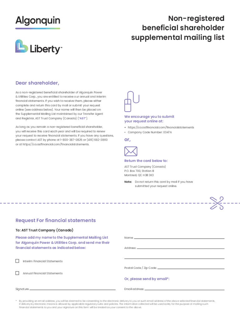 Nonregistered beneficial shareholder supplemental mailing listener shareholder, As a nonregistered beneficial shareholder of Algonquin Power Utilities Corp., you are entitled to receive our annual