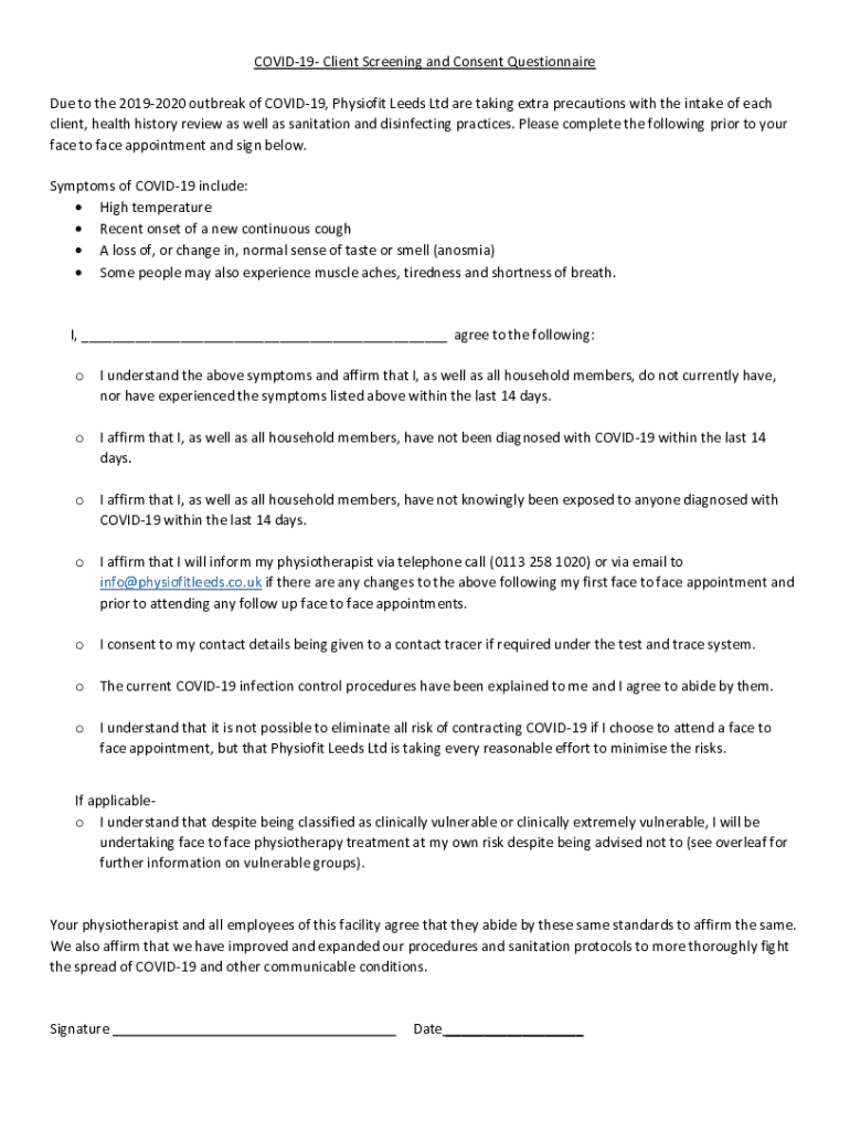 COVID-19 Client Screening and Consent Questionnaire Due to the 20192020 outbreak of COVID-19, Physio fit Leeds Ltd are taking extra precautions with the intake of each client, health history review