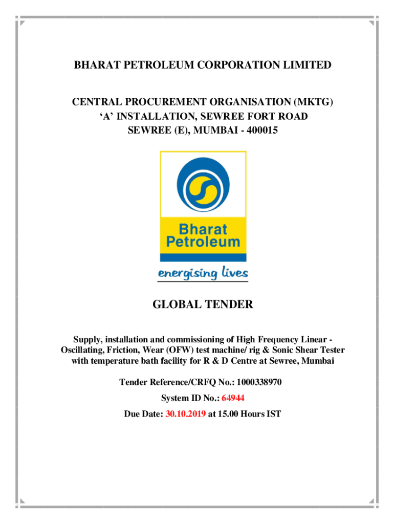 BHARAT PETROLEUM CORPORATION LIMITED CENTRAL PROCUREMENT Organization (MKT) A INSTALLATION, DEGREE FORT ROAD DEGREE (E), MUMBAI 400015GLOBAL TENDER Supply, installation and commissioning of High Frequency