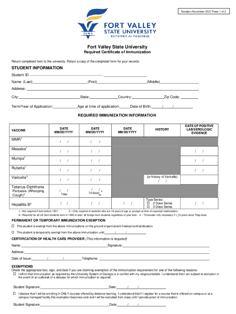 Revision November 2021-Page 1 of 2Fort Valley State University Required Certificate of Immunization Return completed form to the university. Retain a copy of the completed form for your records. STUDENT