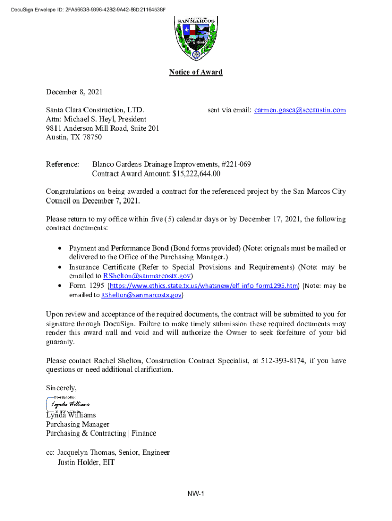 DocuSign Envelope ID: 2FA56638939642829A4286D21164538FNotice of Award December 8, 2021, Santa Clara Construction, LTD. Attn: Michael S. Hal, President 9811 Anderson Mill Road, Suite 201 Austin, TX