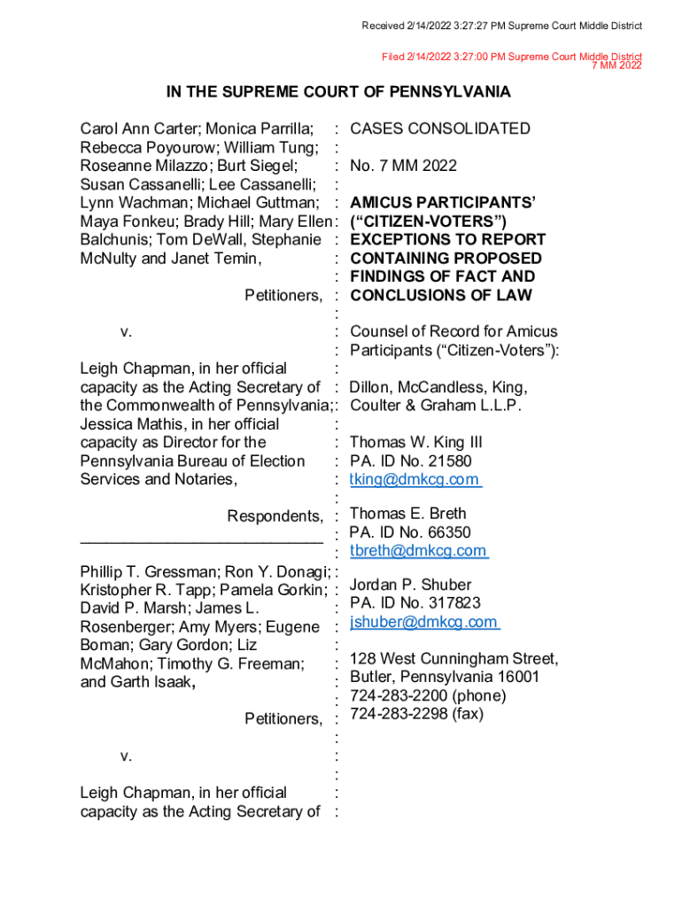 Received 2/14/2022 3:27:27 PM Supreme Court Middle District Filed 2/14/2022 3:27:00 PM Supreme Court Middle District 7 MM 2022IN THE SUPREME COURT OF PENNSYLVANIA Carol Ann Carter; Monica Carrillo;
