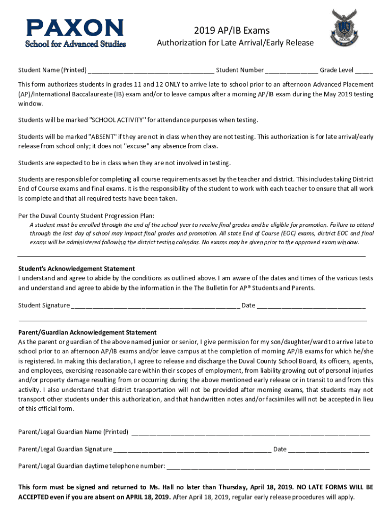 PAXON2019 AP/IB Exams Authorization for Late Arrival/Early ReleaseStudent Name (Printed) ___ Student Number ___ Grade Level ___ This form authorizes students in grades 11 and 12 ONLY to arrive late
