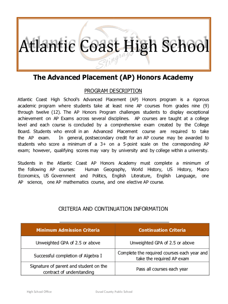 Atlantic Coast High School The Advanced Placement (AP) Honors Academy PROGRAM DESCRIPTION Atlantic Coast High School\'s Advanced Placement (AP) Honors program is a rigorous academic program where