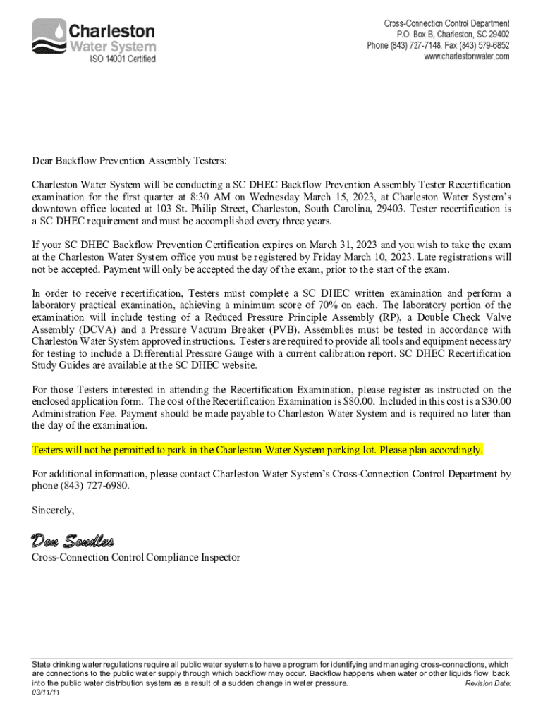 Dear Backflow Prevention Assembly Testers: Charleston Water System will be conducting an SC DEC Backflow Prevention Assembly Tester Recertification examination for the first quarter at 8:30 AM on