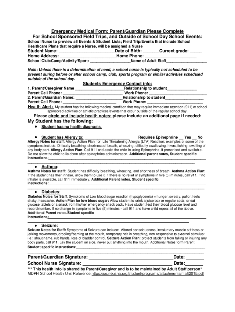 Get the free Emergency Medical Form: Parent/Guardian Please ...