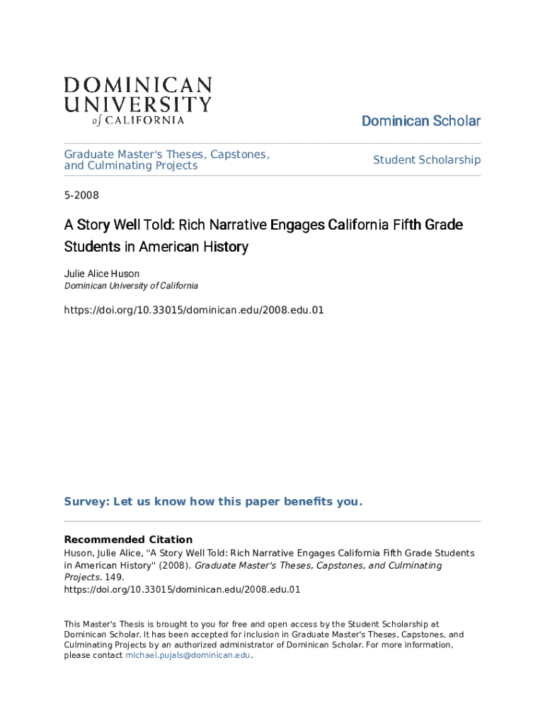 Dominican Scholar Graduate from Master\'s Theses, Capstones, and Culminating ProjectsStudent Scholarship52008A Story Well Told: Rich Narrative Engages California Fifth Grade Students in American History