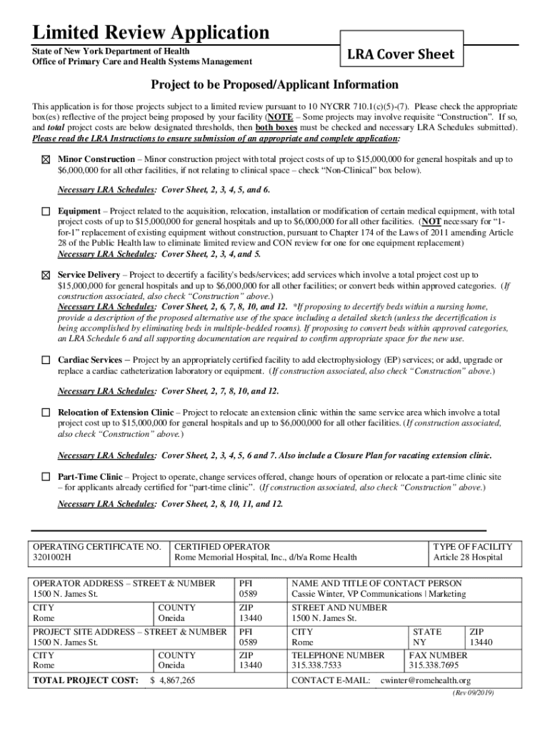 Limited Review Application State of New York Department of Health Office of Primary Care and Health Systems Management Cover SheetProject to be Proposed/Applicant Information This application is for