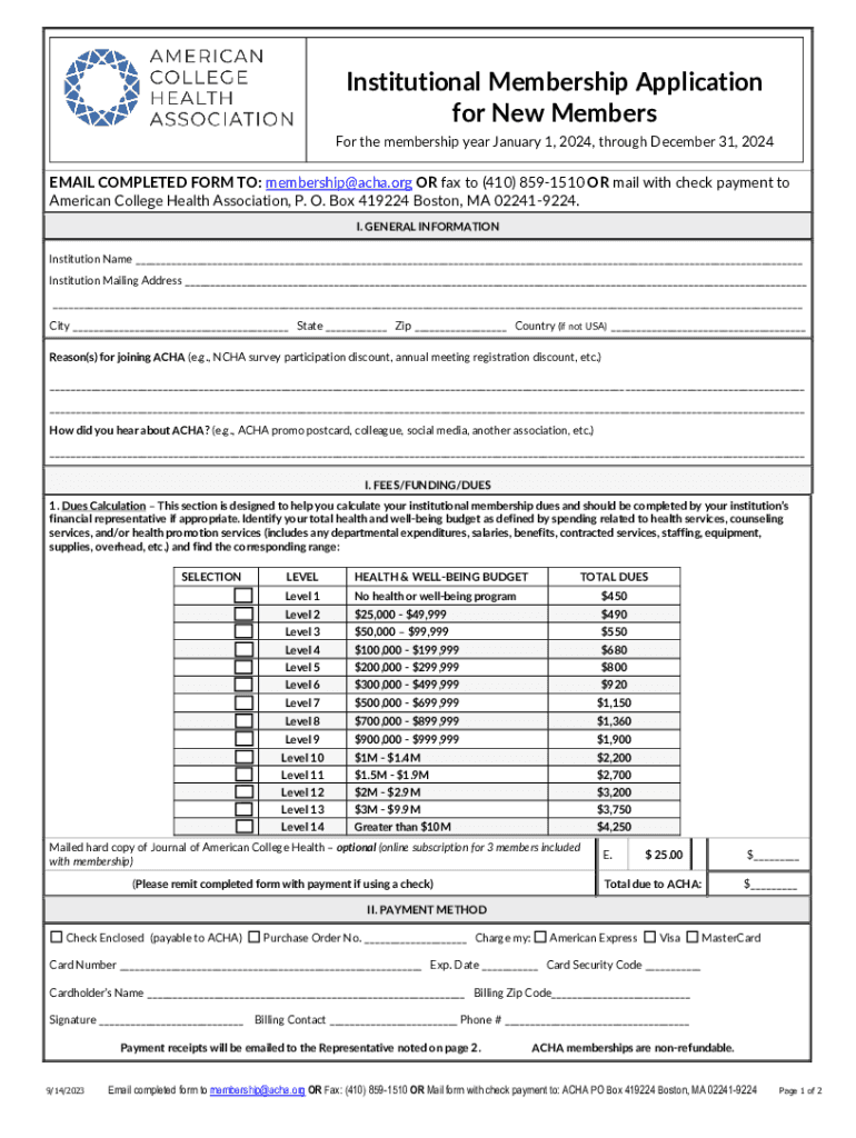 Institutional Membership Application for New Members For the membership year January 1, 2024, through December 31, 2024EMAIL COMPLETED FORM TO: membership@acha.org OR fax to (410) 8591510 OR mail