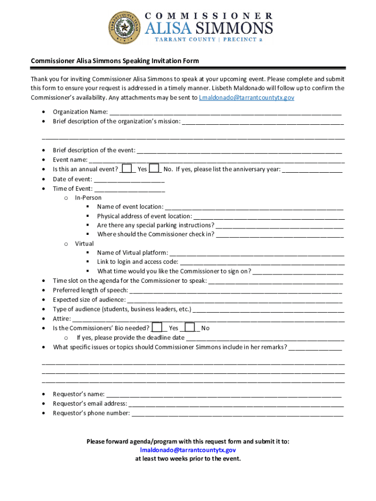 Commissioner Alisa Simmons Speaking Invitation Form Thank you for inviting Commissioner Alisa Simmons to speak at your upcoming event. Please complete and submit this form to ensure your request is