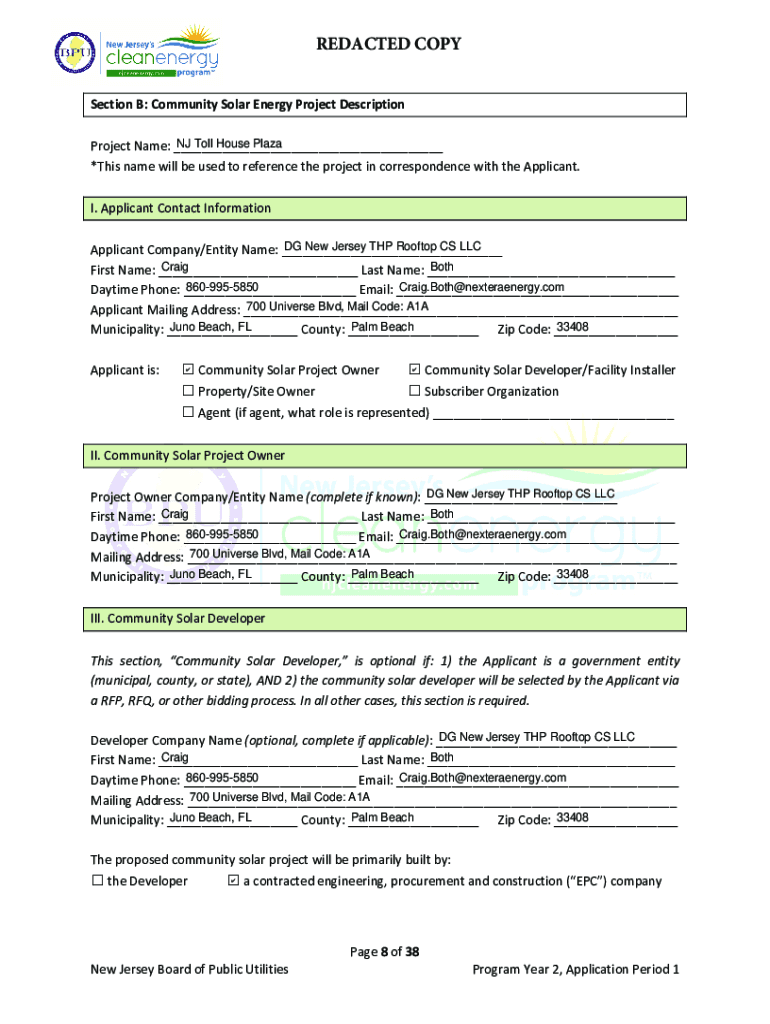 REDACTED COPY Section B: Community Solar Energy Project Description NJ Toll House Plaza Project Name: ___ *This name will be used to reference the project in correspondence with the Applicant. I.