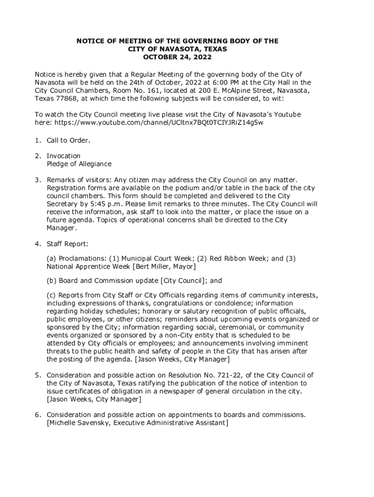 Get the free Navasota will be held on the 24th of October, 2022 at 6:00 PM at the City Hall in the