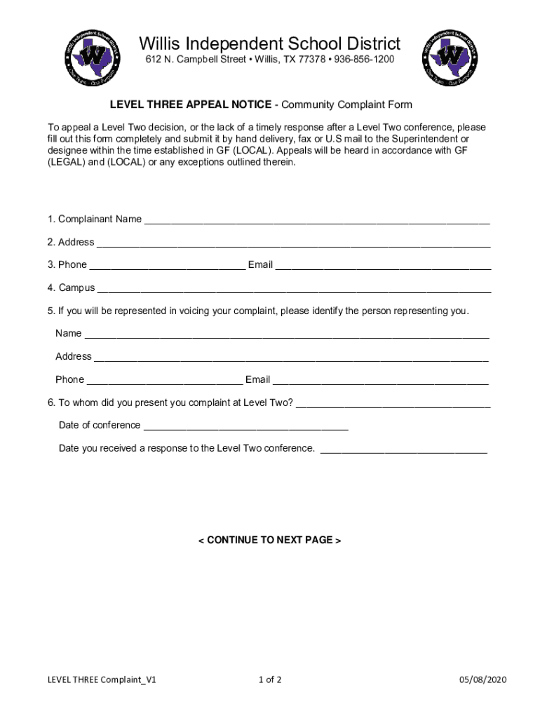 Willis Independent School District 612 N. Campbell Street Willis, TX 77378 9368561200LEVEL THREE APPEAL NOTICE Community Complaint Form To appeal a Level Two decision, or the lack of a timely response