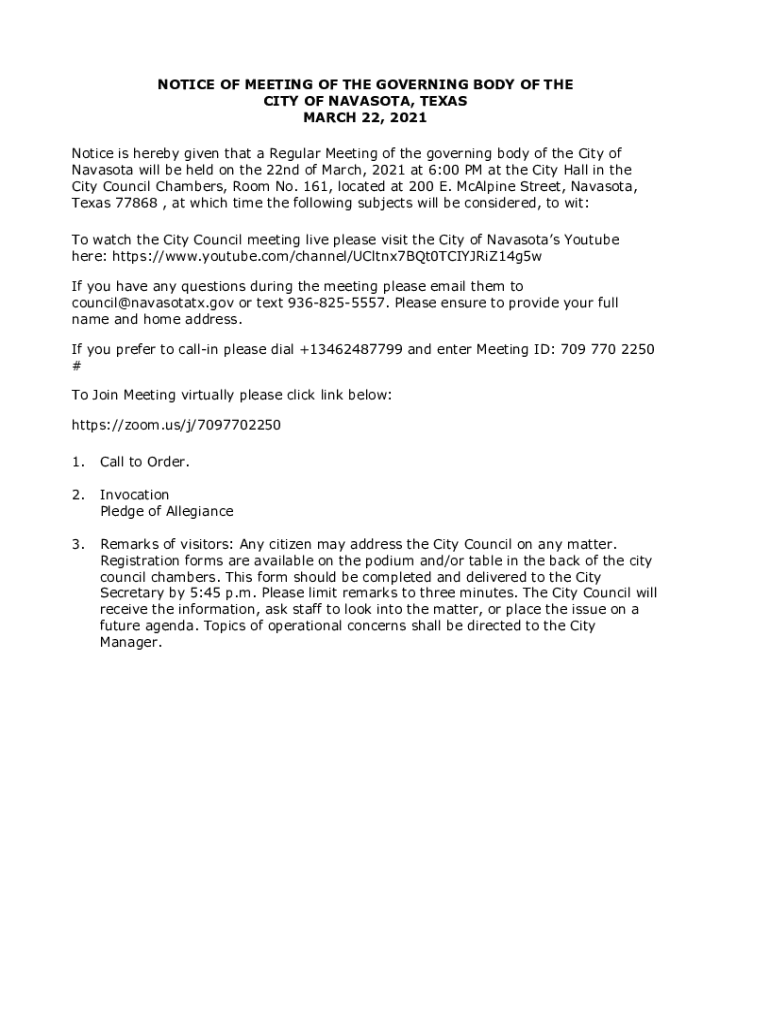 Get the free Navasota will be held on the 22nd of March, 2021 at 6:00 PM at the City Hall in the