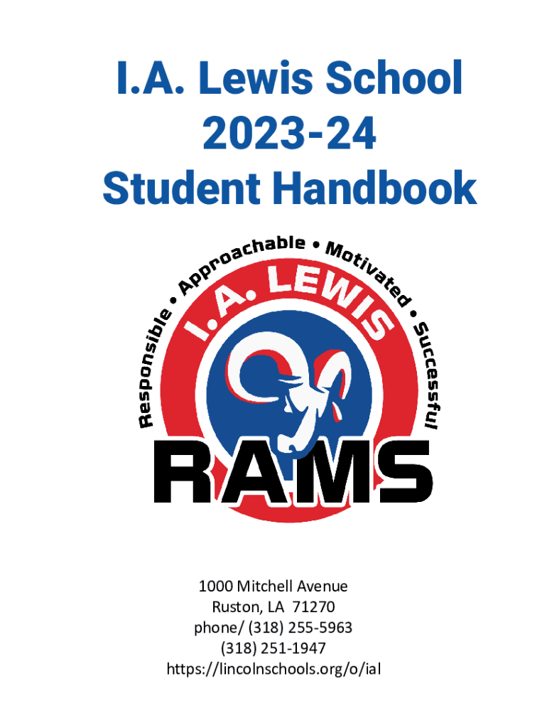 I.A. Lewis School 202324 Student Handbook1000 Mitchell Avenue Huston, LA 71270 phone/ (318) 2555963 (318) 2511947 https://lincolnschools.org/o/ialWELCOME The administration and staff would like to