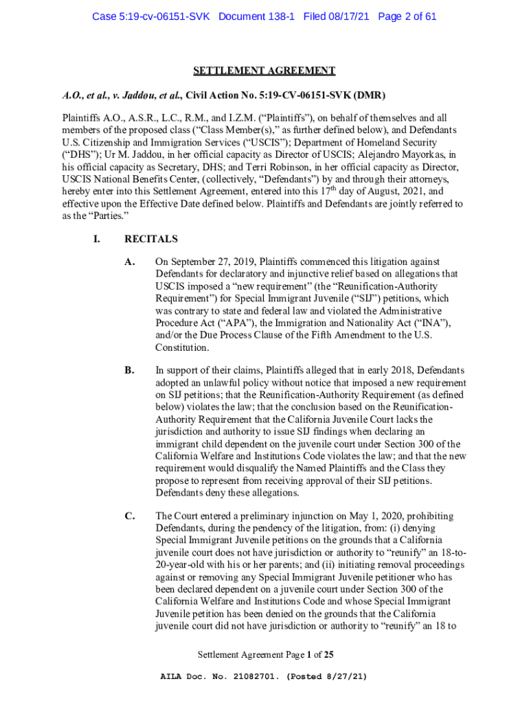 Case 5:19cv06151SVK Document 1381 Filed 08/17/21-Page 2 of 61SETTLEMENT AGREEMENT A.O., et al., v. Maddox, et al., Civil Action No. 5:19CV06151SVK (DMR) Plaintiffs A.O., A.S.R., L.C., R.M., and I.Z.M.