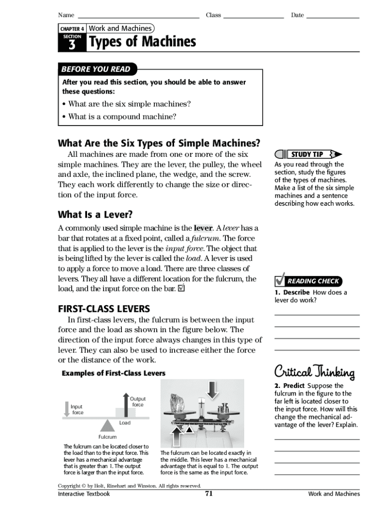 Name CHAPTER 4ClassDateWork and Machines3 Types of MachinesSECTIONBEFORE YOU READ After you read this section, you should be able to answer these questions: What are the six simple machines? What