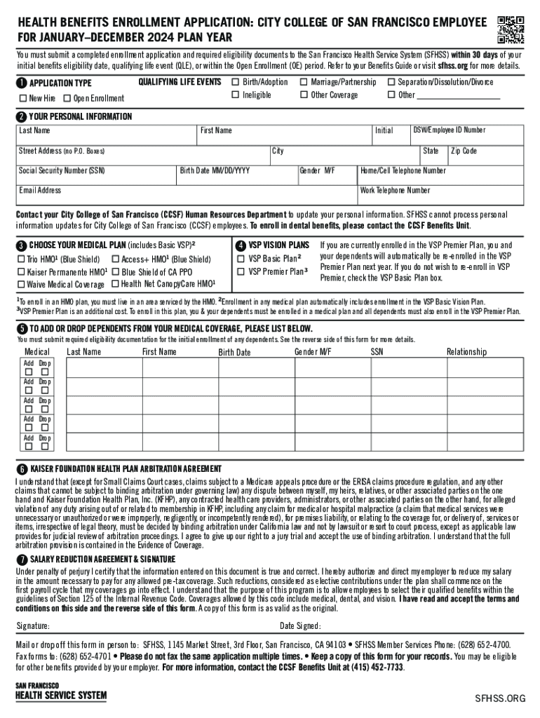 HEALTH BENEFITS ENROLLMENT APPLICATION: CITY COLLEGE OF SAN FRANCISCO EMPLOYEE FOR JANUARYDECEMBER 2024 PLAN YEAR MF SF CCD Application must submit a completed enrollment application and required