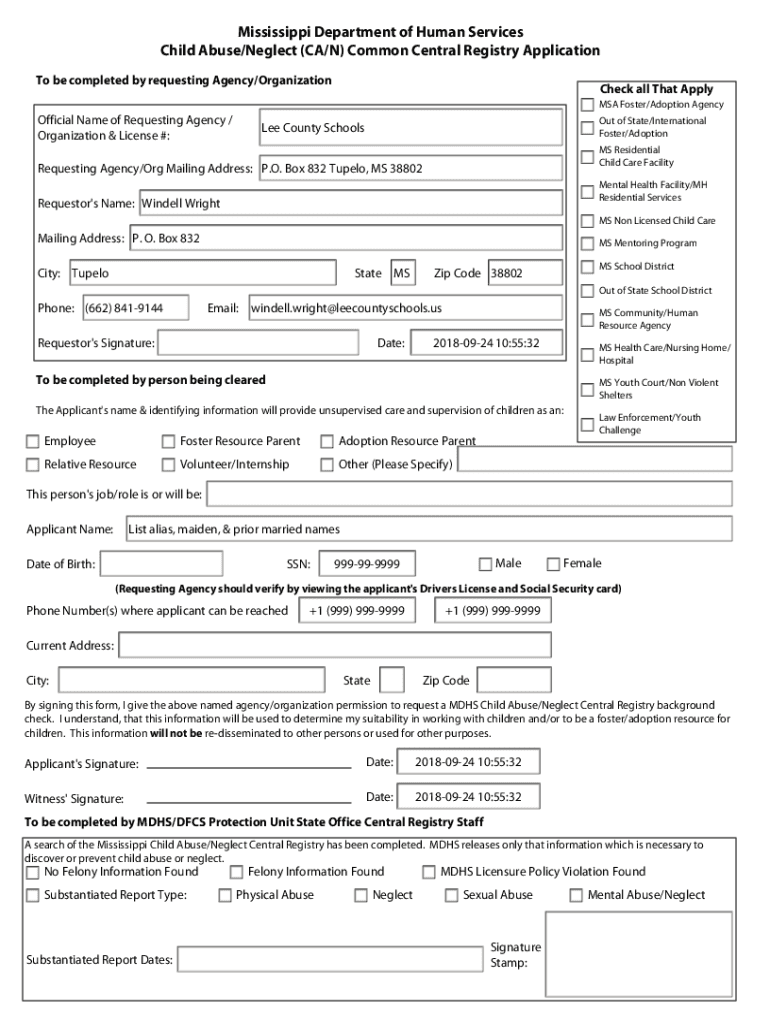Mississippi Department of Human Services Child Abuse/Neglect (CA/N) Common Central Registry Application To be completed by requesting Agency/OrganizationCheck all That Apply MSA Foster/Adoption AgencyOfficial