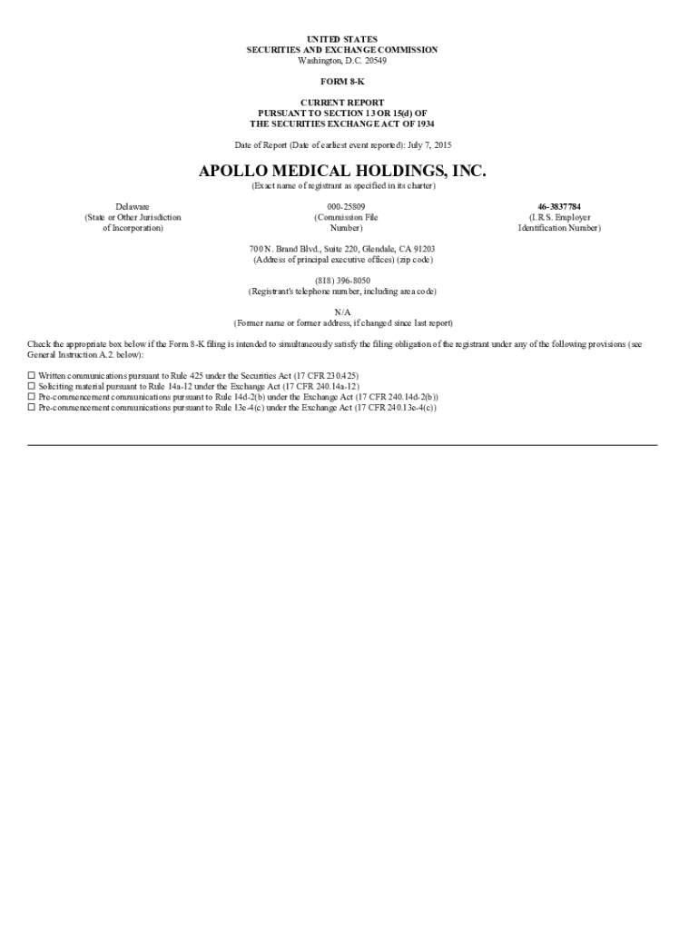 Get the free On July 7, 2015, Apollo Medical Holdings, Inc