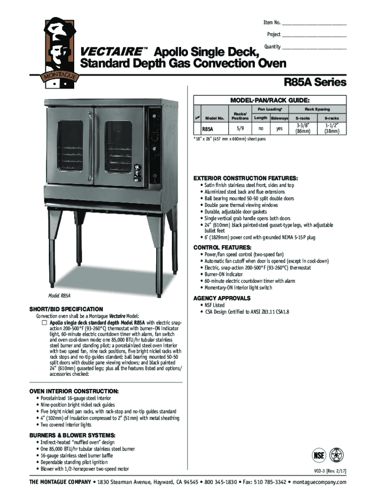 Item No. ___ Project ___ Quantity ___Apollo Single Deck, Standard Depth Gas Convection OvenR85A Series MODEL PAN/RACK GUIDE: Model No. R85ARacks/ Positions5/9Pan Loading* Length SidewaysnoyesRack